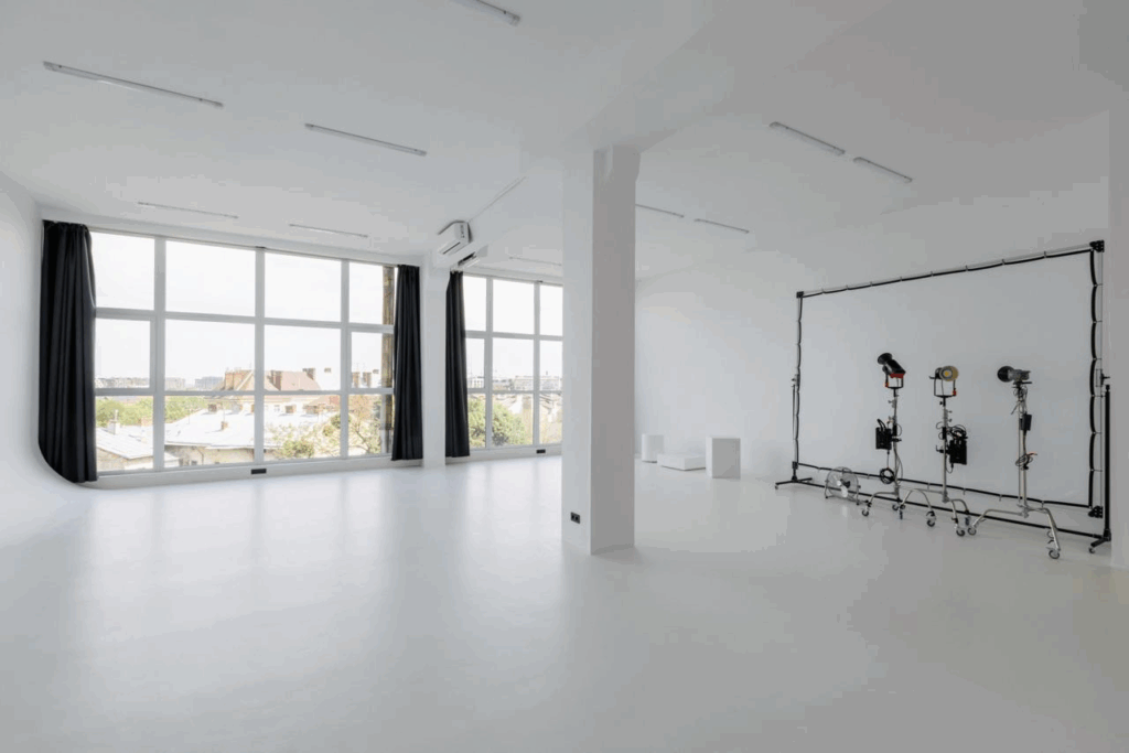 Предметка/контент. Важливі фон-системи, робочі столи, рівномірне постійне світло, можливість небагатолюдної оренди. Panorama й FABRIK мають великі зони з циклорамами; для бюджетних сетів розгляньте студії з почасовими «економ»-залами.