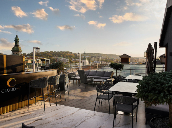 П’ятизірковий готель у центрі міста поєднує класику, розкіш і сучасний комфорт. Просторий зал із прозорим куполом створює ефект театральної сцени для освідчення, а скляна тераса на даху відкриває панораму Львова.