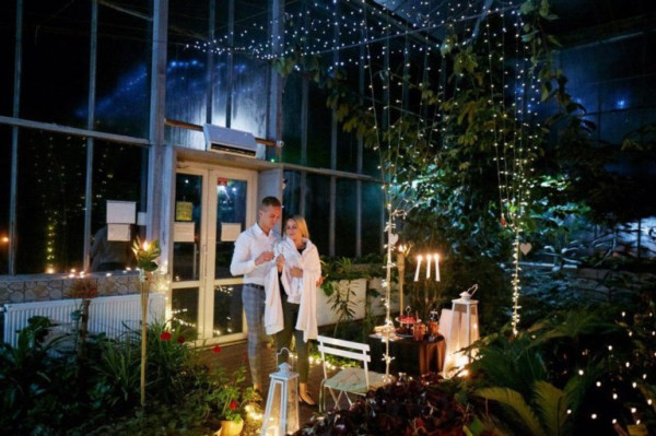 Освідчення серед екзотичних рослин виглядає ніжно та нестандартно, адже поєднує природу й камерність простору. Такий формат ідеально підходить для пар, які прагнуть відійти від класичних сценаріїв і наповнити момент природною гармонією та тишею.