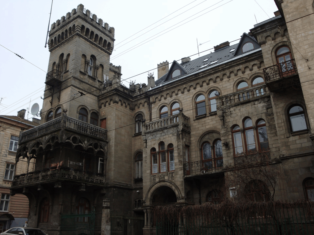 Цей палац складається з двох будівель у псевдоготичному стилі з елементами венеційської готики. Архітектор Іван Левинський створив споруду, яка більше схожа на замок із вежами та гербами.